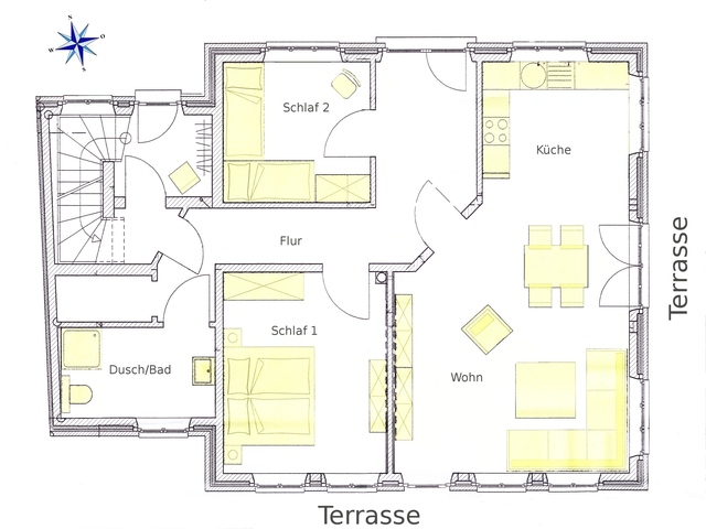Im Erdgeschoss befindet sich ein großer, heller Wohnraum mit integrieter Einbau-Küche, von der aus Sie Blick auf die Nordsee haben. Es stehen Ihnen zwei separate Schlafräume sowie ein barrierefreies Duschbad zur Verfügung. Für sonnige Stunden laden die beiden südlich bzw. süd-ostlich ausgerichtete Terassen zum Verweilen und Geniessen ein. Ein Strandkorb und Gartenmöbel steht zur freien Verfügung