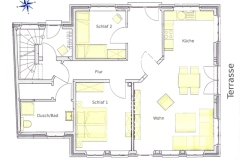Im Obergeschoss befindet sich ebenfalls ein großer, heller Wohnraum mit integrieter Einbau-Küche, aus der Sie einen Meerblick haben. Diese Wohnung besitzt zwei separate Schlafräume zur Erholung sowie ein geräumiges Duschbad. Zum Verweilen bei sonnigen Stunden lädt der südlich ausgerichtete Balkon und die für Sie bereitgestellten Gartenmöbel ein.